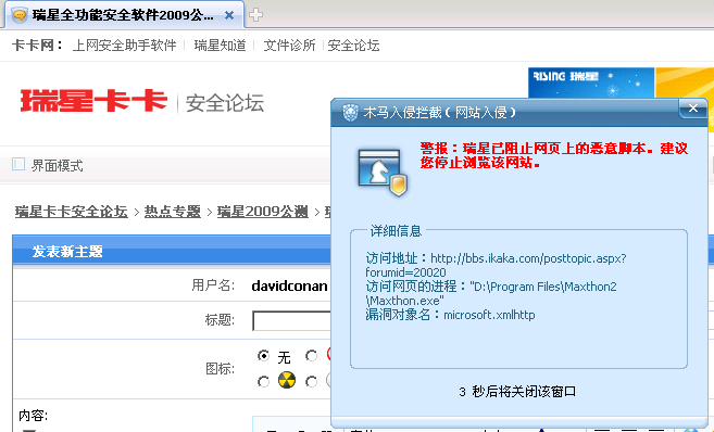 问题现象:在瑞星卡卡论坛发帖提示网站入侵