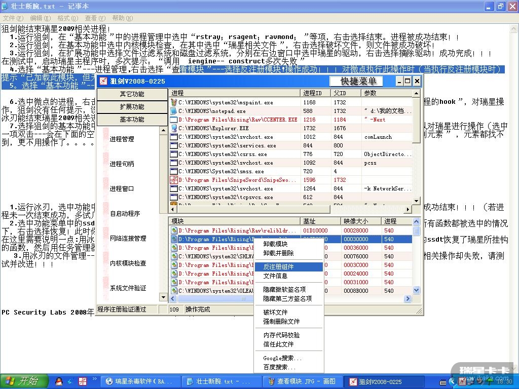 选择“基本功能”---进程管理,右击选择“查看模块”---选择反注册模块!操作成功!!!对x执行此操作时(当执行反注册模块时)提示“已加载此模块,但无法找到dllunregisterserver输入点,无法注册此文件。请改进瑞星!!!