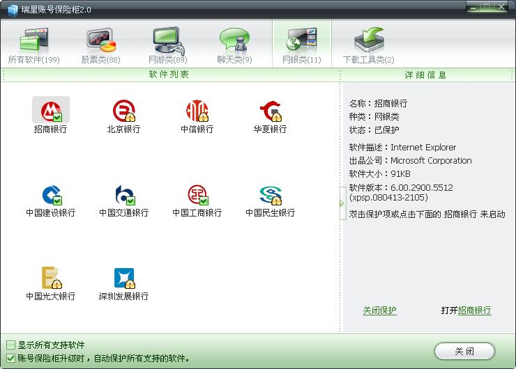如下图所示,“网银类”显示支持11种,而实际只有10种,勾选“显示所有支持软件”也是如此。