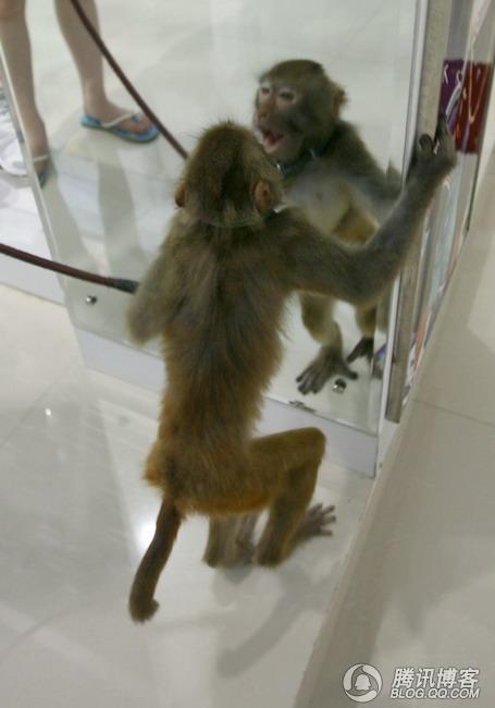原来,猴子一见到镜中的自己时并不知道是自己,甚至怀疑是来抢食的同类,所以一开始面对镜中的猴子时还露出凶相,甚至扑上去想咬镜中的猴子。不一会儿后,聪明的猴子或许就知道了镜中的猴子就是自己,所以开始对镜中的猴子表示友善起来,并轻轻地凑上去与镜子中的自己“接吻”。