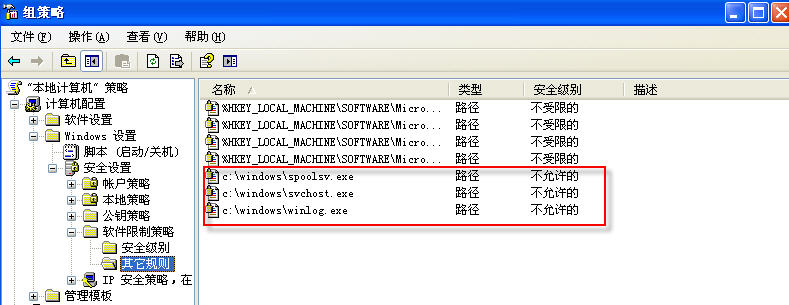 2、进程列表中可见c:\windows\spoolsv.exe和c:\windows\svchost.exe,两个进程相互守护。手工杀毒前,先按见下图设置软件限制策略,再结束病毒进程才行。