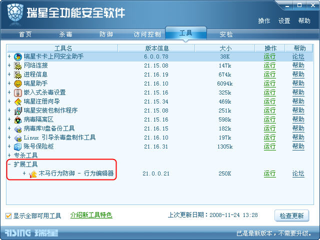 木马行为防御行为编辑器属于瑞星工具,是用于管理木马行为防御自定义记录的可视化工具。安装瑞星杀毒软件2009版或瑞星全功能安全软件2009版,升级到最新版本。点击【工具】,选择【检查更新】,更新后即可看到该工具。