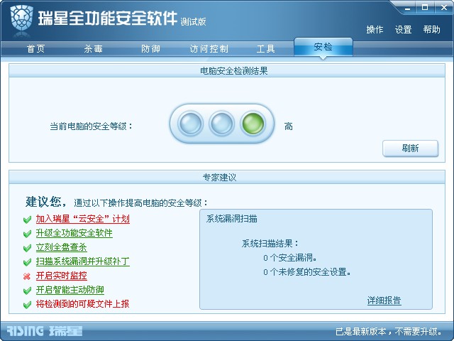 可以改为开启全部监控。。。如果网络监控没有开的。。就改为。。部分监控未开启。。。像这样安检的太过来笼统。。不够优化不够真实,,我关了一个文件监控。。安检就马上显示X。。但是后面的字却显示“开启所以监控”。是否不妥