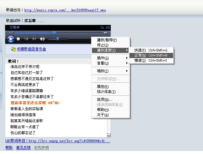 在弹出的网页播放器——Windows Media Player,在该播放器中左键单击击,在弹出中选择播放速度为正常。详细看截图