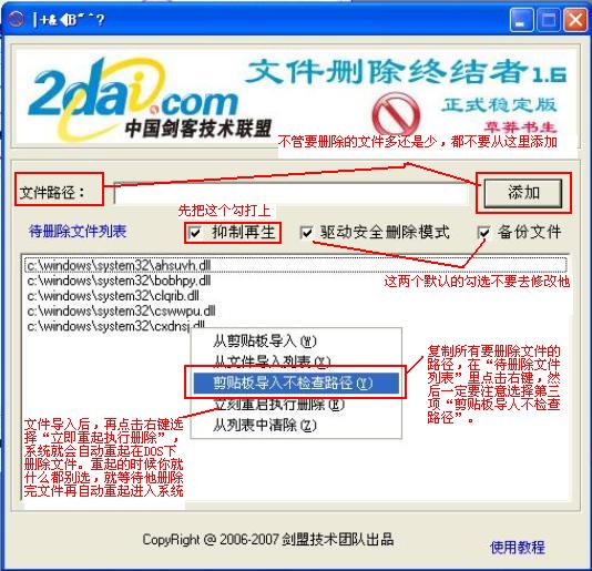 使用说明:删除时复制所有要删除文件的路径,在待删除文件列表里点击右键选择从剪贴板导入不检查路径,导入后在要删除文件上点击右键,选择立刻重启删除,电脑会重启进入DOS界面进行删除操作。运行xdelbox前最好卸载所有可移动存储介质(包括U盘,MP3,手机存储卡等)。
