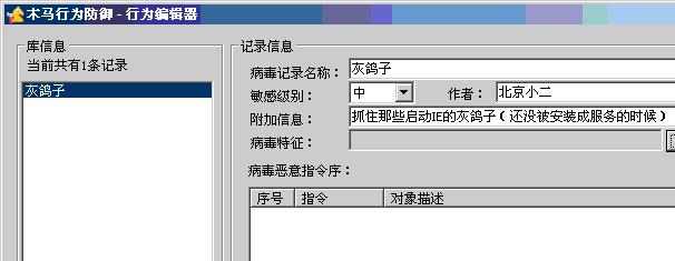 1、该工具包含【库信息】和【记录信息】两大部分,【库信息】就是添加、删除、导入、导出和生成规则的。【记录信息】就是具体对规则进行描述的,包含记录名称、敏感级别、规则作者、抽象的病毒特征、形象化的恶意指令序列等等。特别说一下,添加规则作者后,当规则生效时,在瑞星主动防御的弹出界面是可以看到作者名称的!:)