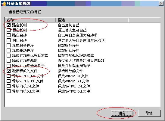 然后呢,它又运行了这个它释放的文件(C:\WINDOWS\GDNSRV.EXE),恰好是“激活释放的文件”这个病毒特征,那么,我们把这两个病毒特征选上,然后点确定,如下图: