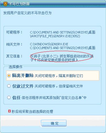 还是点“将记录应用于木马行为防御”,再运行这个灰各鸽子,又报了,注意到红圈里的区别没?可疑程序是进程ID704iexplore.exe哦,这个进程可是灰鸽子的傀儡进程啊!!另外,相关的病毒文件:d:\gdnsrv.exec:\windows\gdnsrv.exe都被找到了,点击“隔离并删除”,好了,危机化解:)