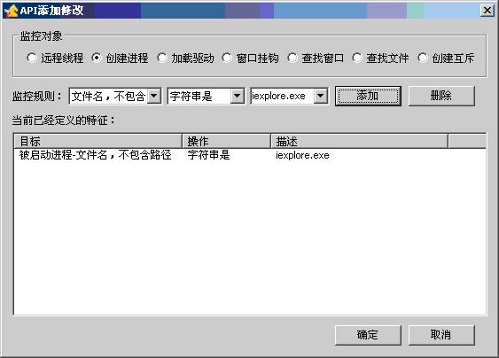 刚才稍微展示了下,但是总的来说,刚才的记录对木马行为的判定太简单了。我们再增加一些条件,将这个记录变得更加精确,这里,我就用“恶意指令序列”了。至少,灰鸽子会启动IE这个特点我就可以抓住了。好,下面开始添加这个“恶意指令”:被启动的进行的文件名是iexplore.exe