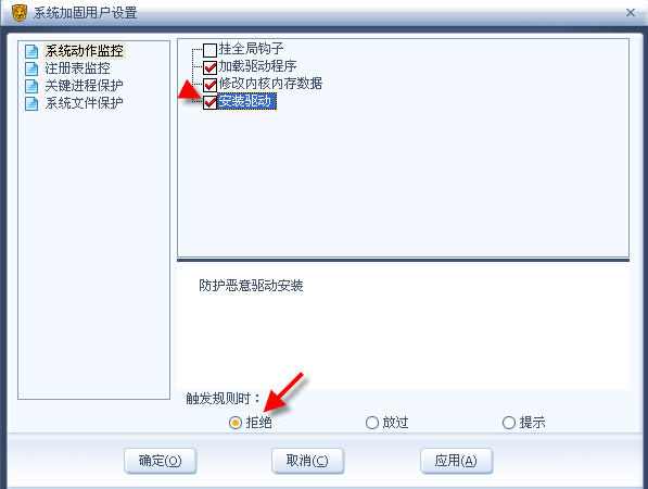注:此设置限制较严。禁止了驱动安装、加载,封死了系统目录以及系统驱动目录。因此,用户安装某些带驱动的应用程序时,应事先断网、关闭瑞星所有监控。然后,再安装。安装完毕,再打开瑞星监控。