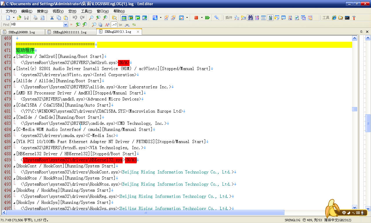 system.exe,HBXXX和HB的签名,已经用红色文字显示PS:加亮仅仅是为了看着分明,仍然不能对任何可疑的项目掉以轻心效果图