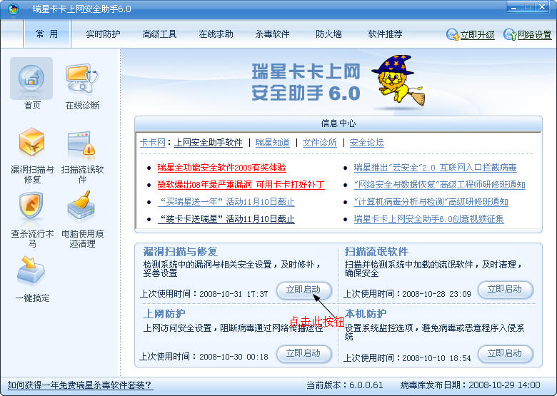 点击首页“漏洞扫描与修复”下的“立即启动”按钮
