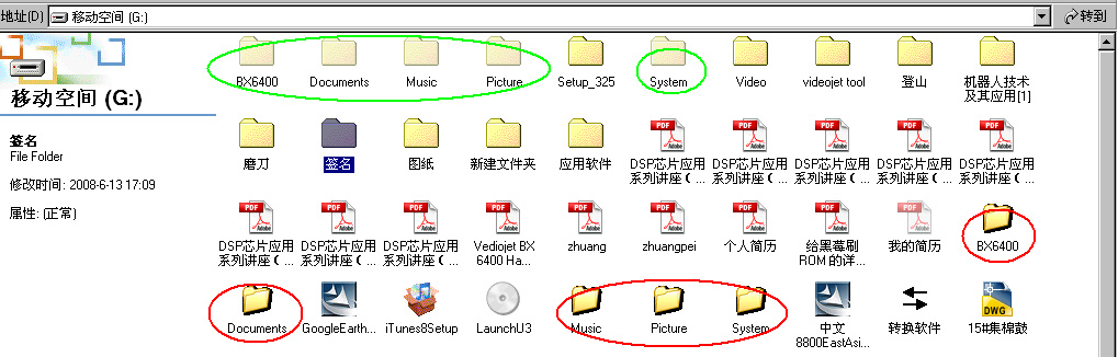 疑似病毒的特征:在U盘中创建和原有文件夹同名的程序,并配上文件夹的图标。然后把原文件夹隐藏。下图中红色圈的是疑似病毒,绿色圈的是被隐藏的原文件夹。