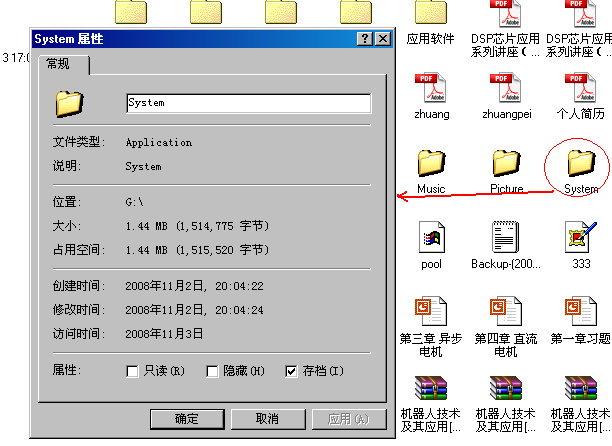 。今天用U盘特别小心,把文件选项里的显示隐藏文件打开,然后把Mcfree升级(正版的,让我对Mcfree失去了信心),插进U盘查了一边,可是没发现病毒。我可不敢大意,右键单机打开,果然发现5个可疑的文件夹(如下图所示)查看属性都是1.44M,随即截屏上报,然后上报。不过仍然心有余悸,希望瑞星尽快出现查杀此病毒。另外,我也不确定我是否已经中招