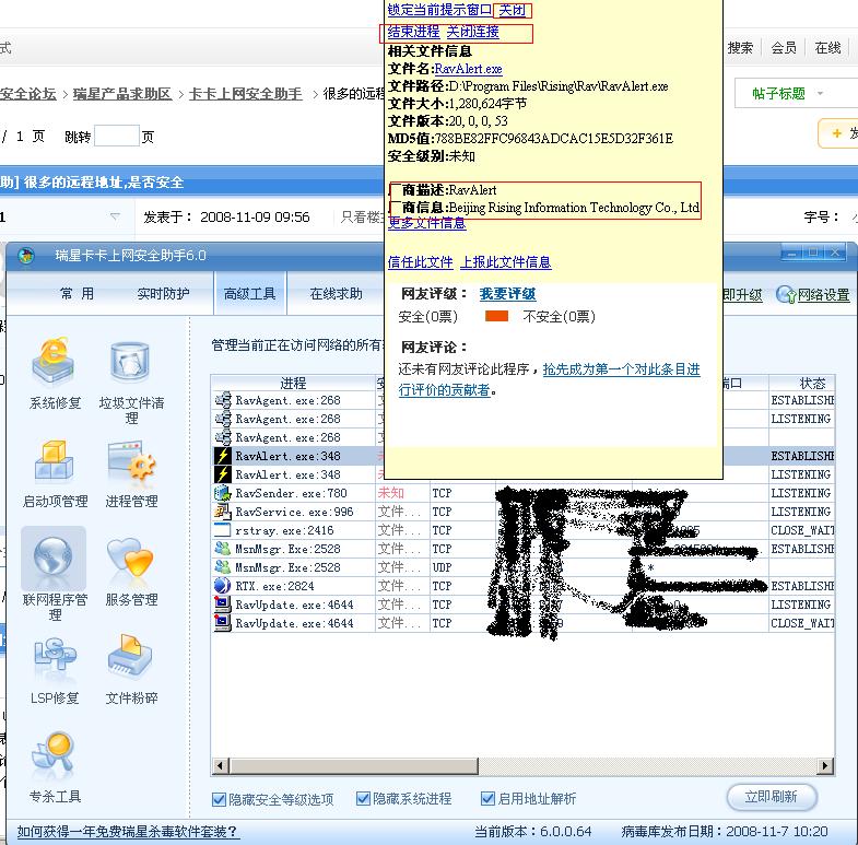 没有答案。进程开启网络端口进行通信是他功能的一部分,未必存在异常。如果需要更进一步确认,可以进行全盘扫描和用第三方工具扫描一份日志上传