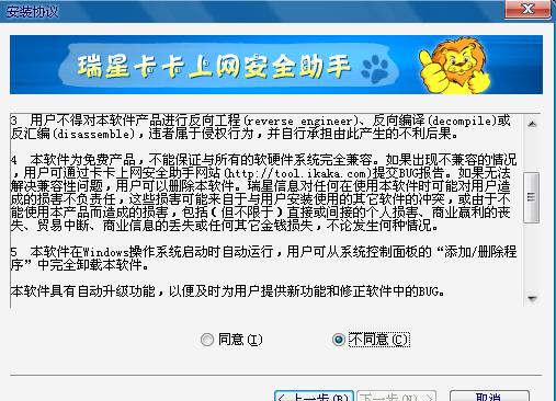 7 选择“同意”,即表明用户信任瑞星信息,自愿选择安装本软件,并接受本协议所有条款。如果用户不接受本协议,不愿安装本软件,请点击“不同意”。