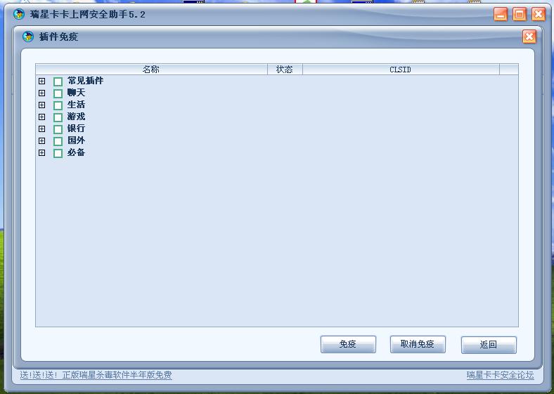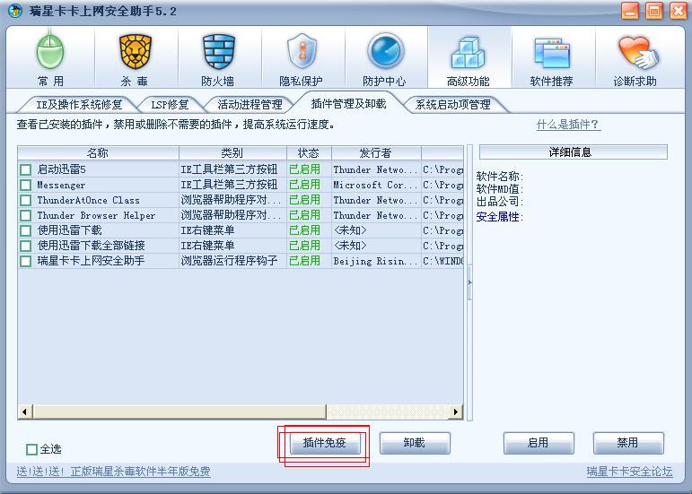 然后在插件管理那里找到[插件免疫],然后将他们全部取消免疫。取消之后,就可以升级到卡卡6.0了