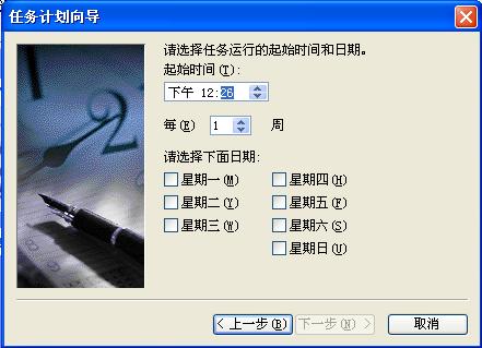 还是用计划任务,在选择启动时间的时候,选择“每周”,“下一步”,要怎么选择就自己看着办了,如图:
