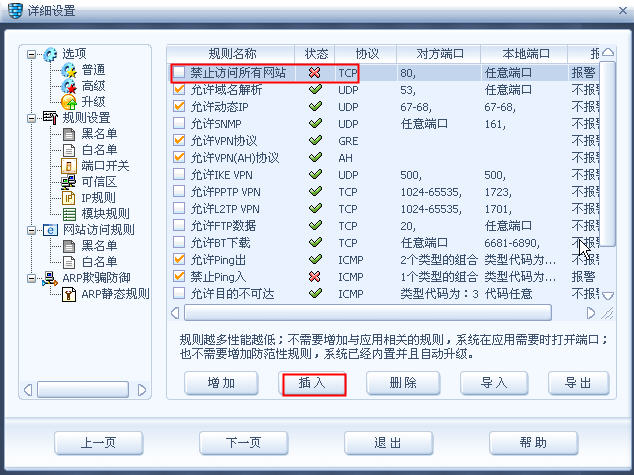 第八步:选中刚添加的规则(这里为“禁止访问所有网站”)后,点击下方的“插入”,如图7: