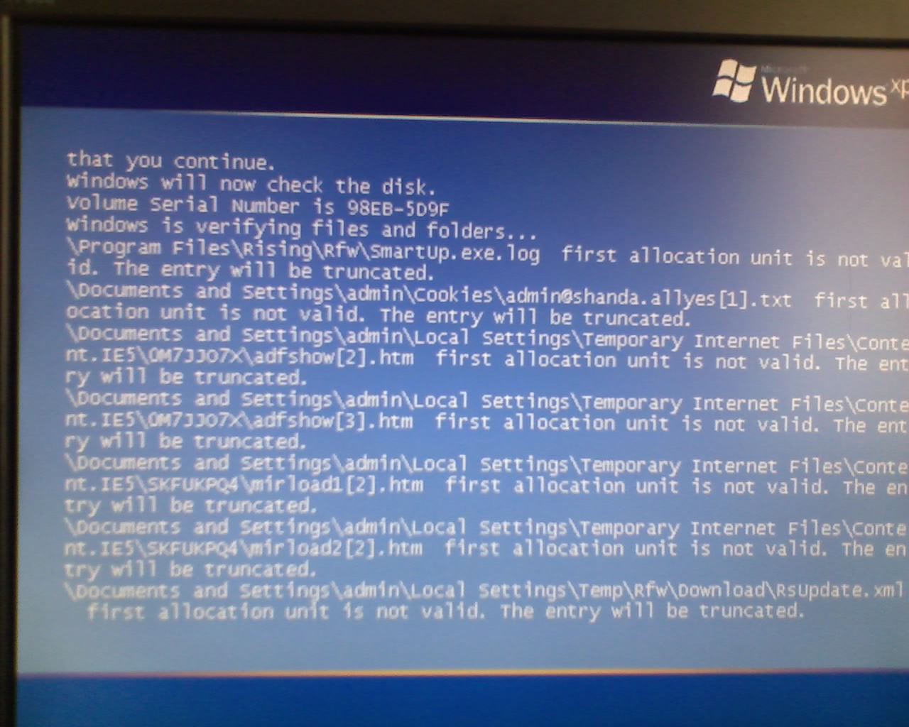 3、从第二个画面看,出错的估计都是死机时正在写入的文件。如果你的系统分区是FAT32格式,建议转换为NTFS格式,这样系统更稳定一些。并应先检查磁盘是否有坏道。