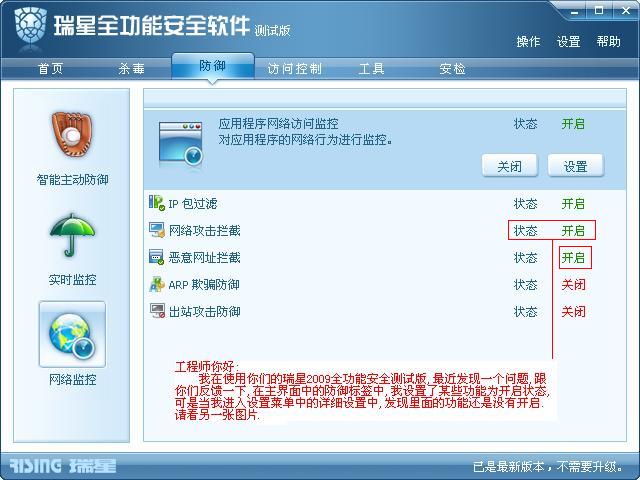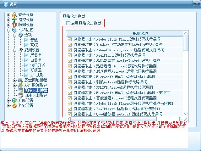 问题现象:我在你们2009全功能版的主界面的防御选项中,设置打开了某些网络监控中的功能,可是发现在你们设置菜单中的详细设置中的,对应网络监控选项中此功能根本就没有成功启用,选择复选框还没选上,还要人工手机选上.