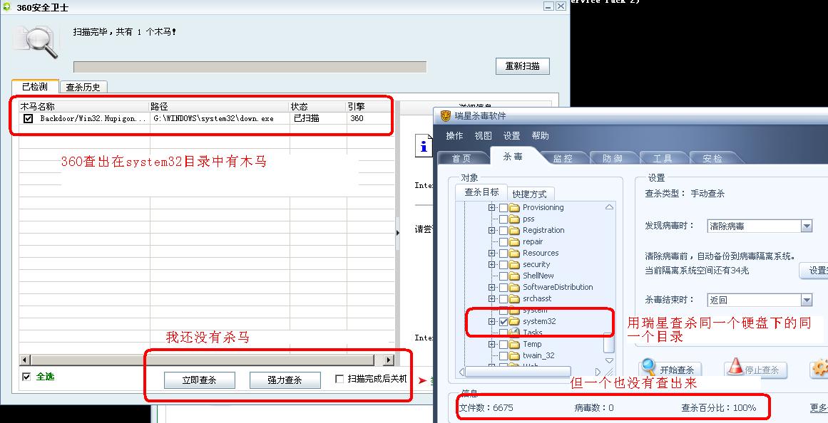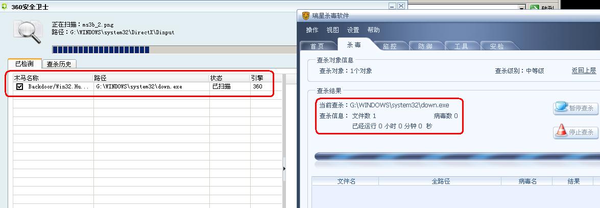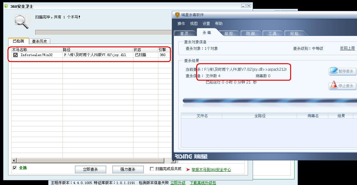 前天想玩玩多年未玩的传奇游戏,忘记了及时雨外挂的官方网站,上搜索引擎搜索“及时雨 官方”,结果出来了许多 及时雨外挂的官方网站 ,我想这么多的网站肯定有许多是有木马的,不管了,随便在其中一个下载,因为我相信瑞星。我下载所有的外挂、游戏登录器等都先用瑞星查杀了,都提示没有病毒、木马,安装或打开时也没有提示有病毒或木马,那么我也安心使用了。可是昨天我打开电脑时发现瑞星监控、360安全卫士都自动关闭了(前天一直在游戏中,没有看状态栏),再打开进行查杀(用360查杀提示有木马),还是自动关闭。进入安全模式查杀,360查出有木马了,我暂不杀之,看看瑞星能否查出,果然瑞星根本就查不出来,怪不得我会中了,用360杀了之后重启电脑,好了。你们看看下面的截图。