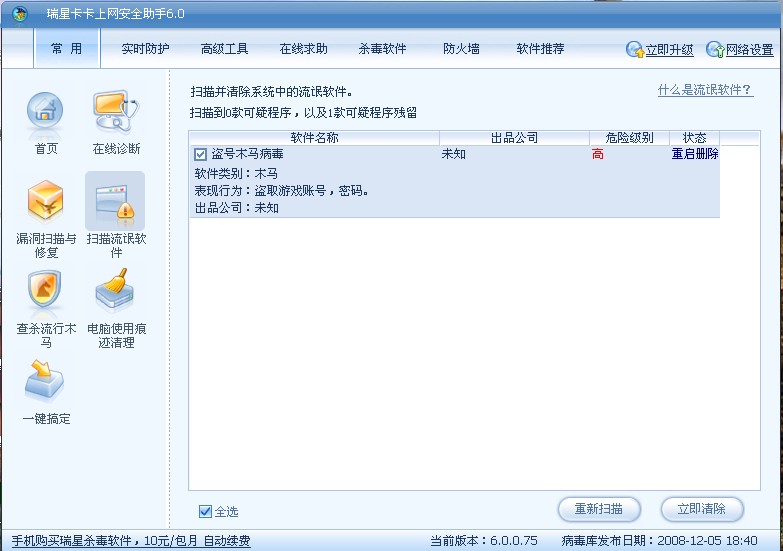 为什么有个叫盗号的木马清楚不了啊?谁能帮我,我用瑞星杀了N次了!~还是不行。