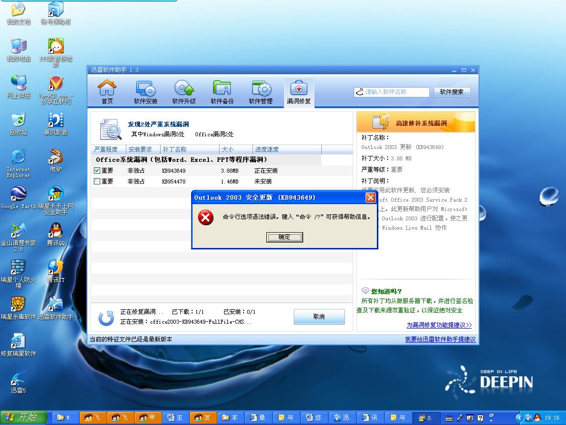 前两天错用了金山的超级AV终结者专杀扫毒,操作错误,结果导致系统异常,网络和联网工具彻底关闭,无奈只好重装了系统。但现在有个问题。讯雷的软件助手发现了两个漏洞,号码为KB943649和KB954478,是OFFICE漏洞,但问题是补不了,无论是独占安装还是安全模式都装不了。而且只有讯雷的软件助手发现了,金山清理和瑞兴的卡卡以及瑞星下载版都没有扫出这两个漏洞。但是前两天重装系统时,金山清理专家曾经卡死过一回,当时心急就点击了7,8个补丁同时下载安装,后来卡死了,不得不重新打开重下载安装。请问这个会不会造成安装的不完全或文件丢失,或者就像现在这样:只有讯雷助手可以扫出漏洞的现象?