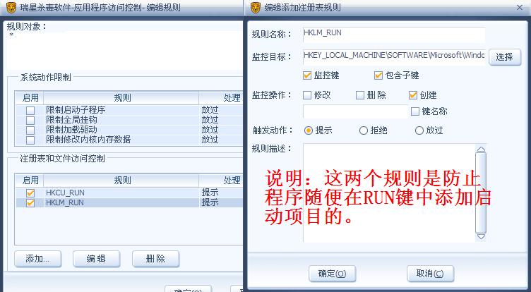 在“主动防御设置”-“应用程序访问控制”中添加了程序的注册表访问控制,这样对注册表的指定键内容有修改是可以发出提示或自动拒绝,可是