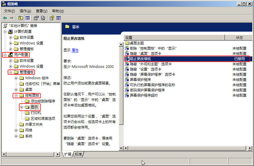 组策略已经按照你的方法设置了,但桌面选项卡下的“背景”选择框仍是灰色的,无法选择桌面墙纸。现我选择了一张照片文件,用右键菜单设置成桌面背景,可以设置,开机过程和关机都不会再改变桌面背景。实在不行的话我也只有这么着了。再次感谢左眼球大大和zg1_2004和小日来了给予我的帮助,感激!