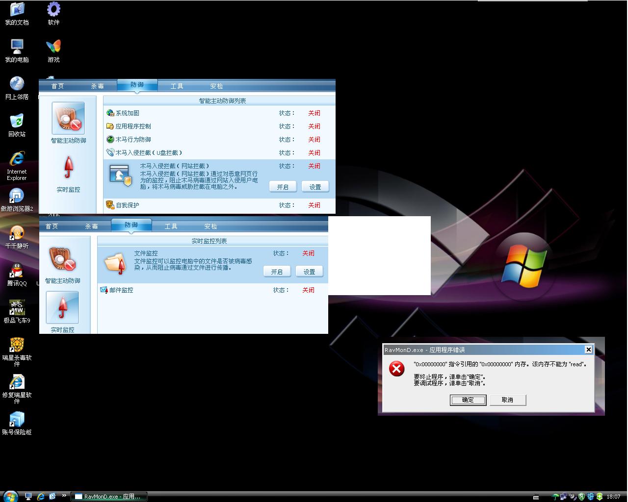 今天我的瑞星杀毒2008升到了09为什么所有的监控都打不开了啊一打开就出现个内存错误,重新修复了几次都不能解决。这是不是09的bug啊???????哪位能给我解决下吗????下面是我的截图
