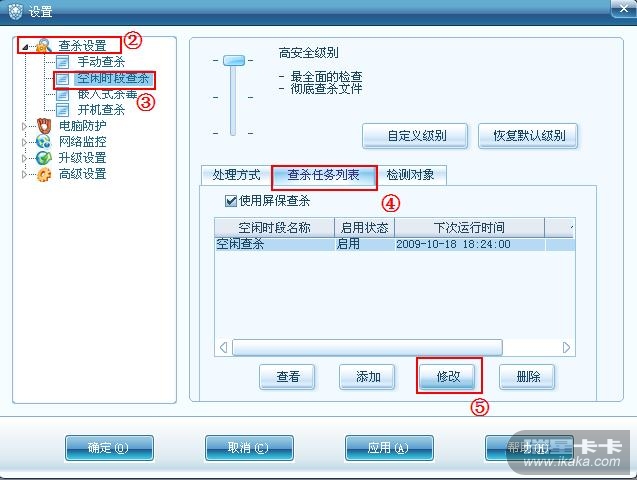 2.一次点击“查杀设置”“空闲时段查杀”“查杀任务列表” “修改” 如图2