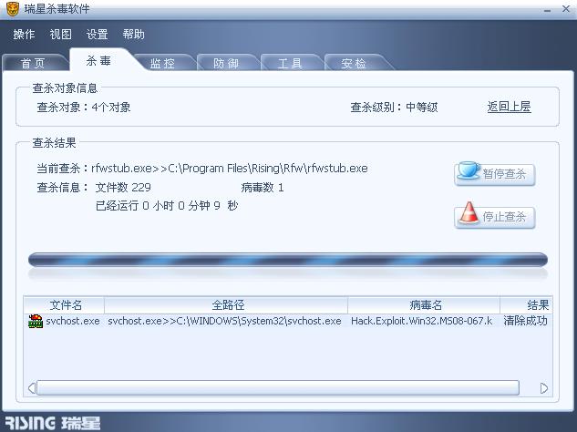 现象是:开机运行一段时间后,有个svchost.exe进程占用CPU100%。重新起机后用瑞星杀毒,如下图。杀完后,所有视频播放器播放时均没有声音,显示提示:“您的声卡设备出现问题,可能您的计算机上没有安装声卡设备或者另一程序正在使用该设备”。并且下次开机后,病毒仍然存在。