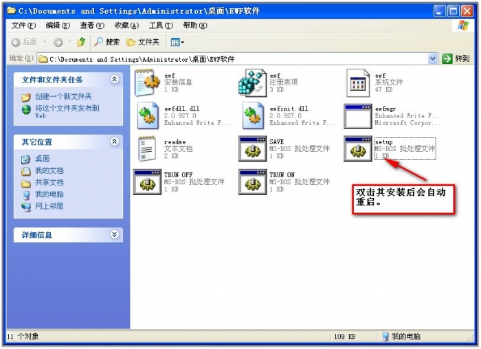 EWF是微软FP2007嵌入式操作系统的一个组件,程序下载后可以解压到任意文件夹,也就是说它是纯绿色无污染的 ,然后双击文件夹中的setup.bat安装,弹出一个命令提示符后会要求重启,于是安装完毕(这里有点快,我没截到图)。