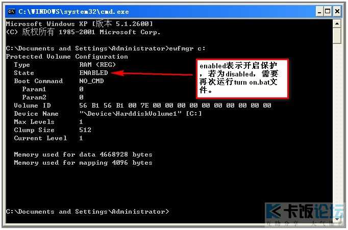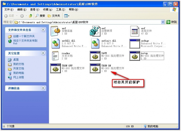 EWF安装好后默认是不提供保护的,需要手动运行文件夹下turn on.bat开启保护,然后系统会再次重新启动。