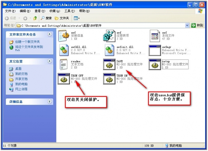 还记得文章开始的黑色加粗字体么?这里需要着重说明下,当C盘处于保护下,如果想升级病毒库或安装些软件来达到保存效果,只需要运行文件夹下的save.bat文件即可,鼠标双击,随即大功告成~