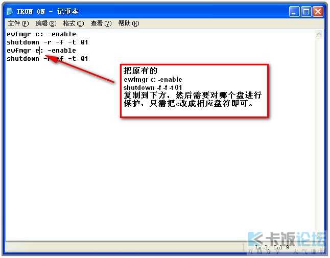 默认的EWF保护只提供系统盘的保护,如果想对其他盘进行保护,只需简单的对turn on.bat简单的动几下手指即可,自己动手丰衣足食,一切就这么简单,如图: