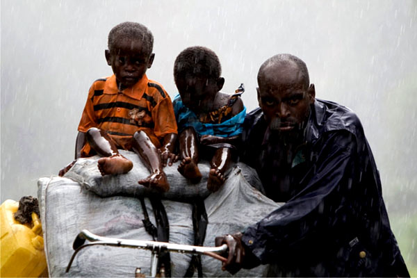 11月2日,爸爸带着两个儿子从刚果的Kibati城出发前往自己在刚果(布)的村庄。政府与反政府军的战乱造成数十万人流离失所. (图片来源:法新社)