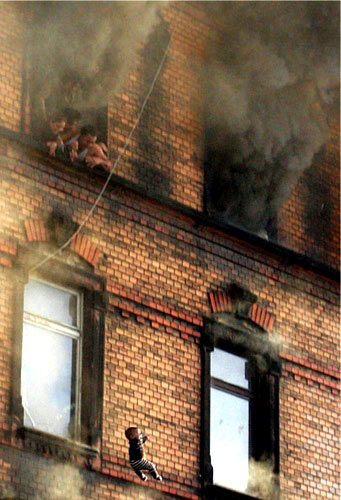 2月3日,德国路德维希港,一户居民从4楼扔下了9个月大的女婴Onur Celar。幸运的是,一名警察成功接住了这名婴儿。这场大火导致9死28伤。 (图片来源:法新社)