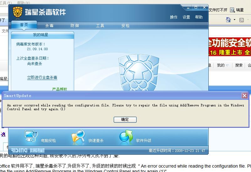 office 软件用不了, 瑞星杀毒杀不了,升级升不了, 升级的时候的时候出现 " An error occurred while reading the configuration file. Please try to repair the file using Add/Remove Programs in the Windows Control Panel and try again.(1)"