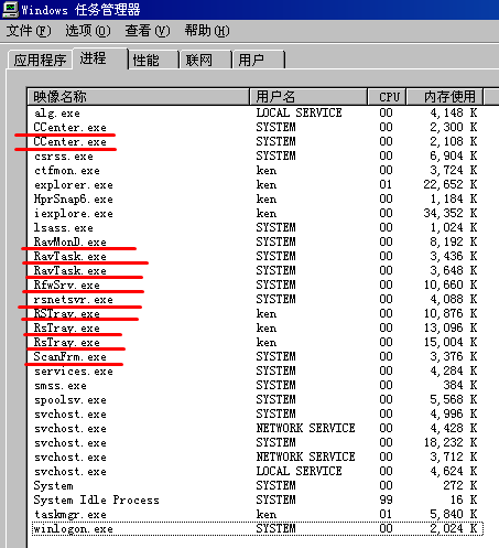 我的瑞星杀软和防火墙升级到2009后,开机登陆后,打开任务管理器,发现瑞星的进程有11项.(如截图)