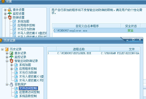 以下是我把Explorer.exe加入到防御白名单后 瑞星自我保护的历史记录