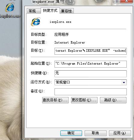2.用鼠标右键单击该快捷方式,选择“属性”,会弹出“Iexplore.exe属性”,选择其中的“快捷方式”标签,然后在“目标”框里填入“C:\Program Files\Internet Explorer\IEXPLORE.EXE” -nohome,给Iexplore.exe加上参数“ -nohome”,输入时注意在参数“ -nohome”前面有一个空格,点击“确定”推出即可。