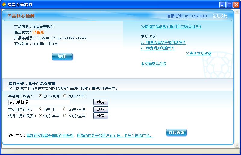 3 我就使用方式一输入我昨天才通过手机购买的30元/半年的瑞星下载版序列号和ID