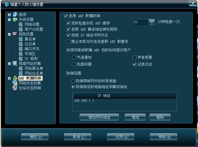 瑞星2009防火墙ARP防御参考设置图: