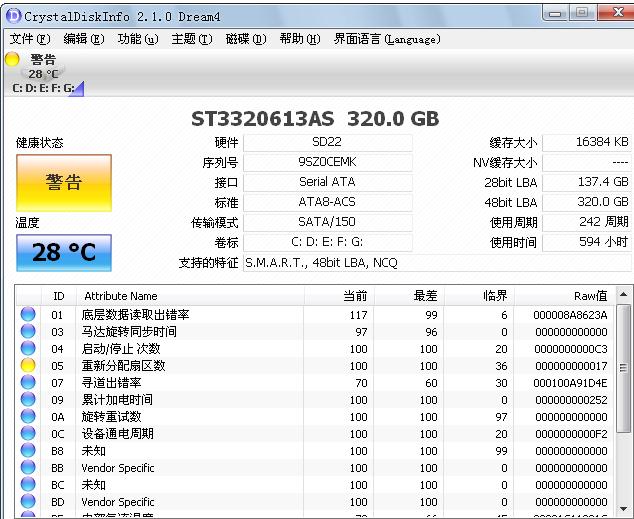 今天下一个,版本:2.1.0.2009,一打开发现硬盘状态是警告我晕,新硬盘才用了三个月呀!!!另外它显示那个重新分配扇区什么意思?说让我重新分还是硬盘碎片太多了?另外这东东测的准吗?