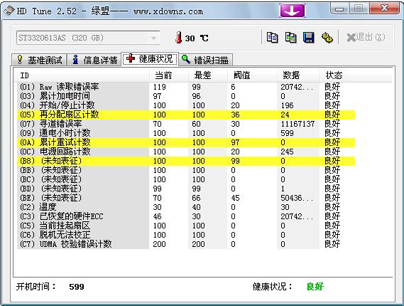 又用HDTUNE看了下,还是那个重新分配扇区数有点问题: