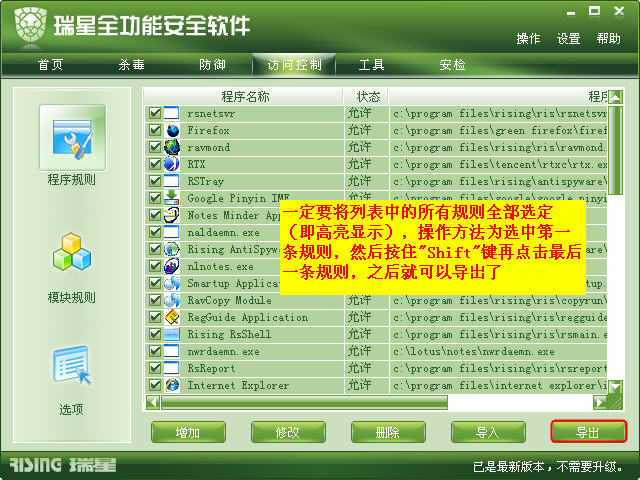 瑞星的规则是可以导出的,如果还原了系统或重装了软件后,可以直接导入