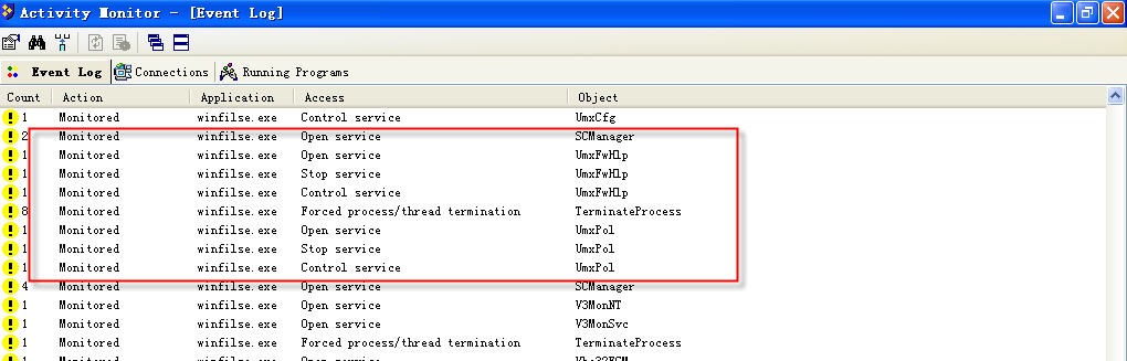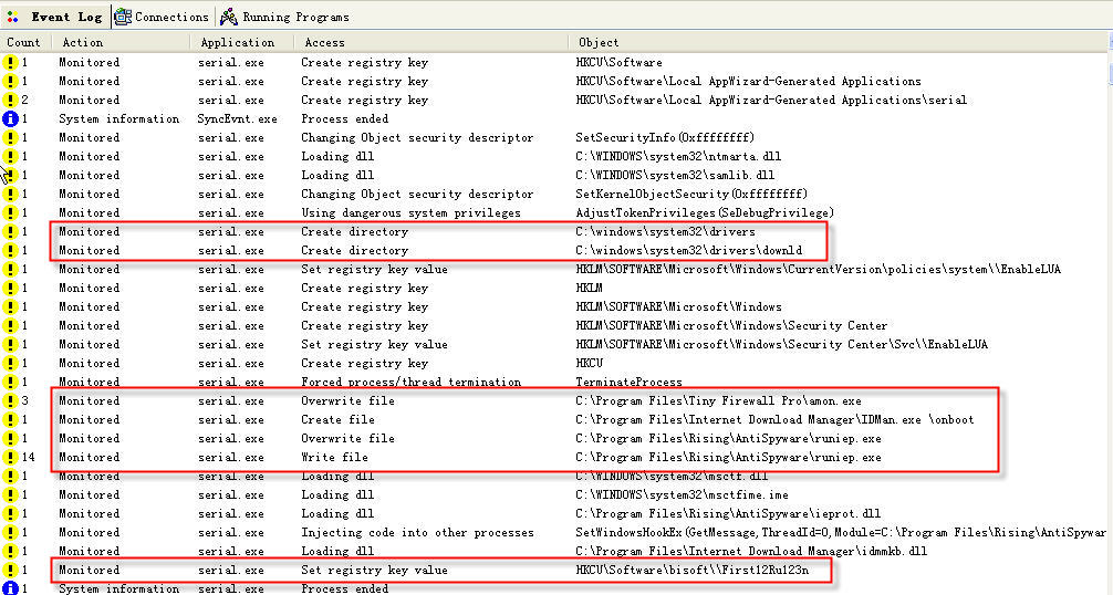 1/上述设置完成后,重启系统,实机运行病毒样本serial.exe。除了两处注册表改动、创建一个病毒文件夹、强拷贝一个病毒主程序winfilse.exe到系统驱动目录外,病毒的其余动作被阻止,病毒进程自动结束。
