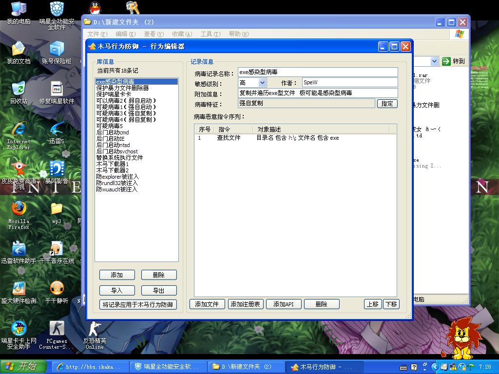 误报不多,菜鸟可以使用。附:为了此次做的完善,更新一个辅助工具的防御型规则,防关闭冰刃窗口(有冰刃的选用,规则在下面单独列出下载),能防止病毒同过窗口发送消息过模拟按键关闭冰刃.至于瑞星和卡卡的此类防护,可疑病毒9就是了.